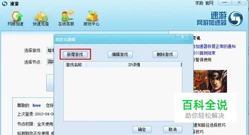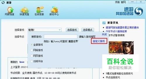 1、启游戏速游客户端,点击选择游戏,可以看到小框的右边有个“自定义游戏”点击它即可打开设置。