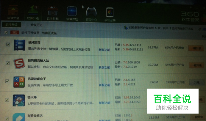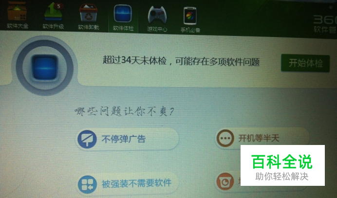 亲们,有时候自己在翻看网页津津有味看得正入迷,当自己想看一段视频,但又不能如愿,一打开视频才看到一秒的广告它突然黑频,很是失望着急吧?怀疑自己电脑是不是坏了,难道是中了病毒了?···等等。脑袋会有一片想法显得手足无措吧? 呵呵,大家不要着急,大家不防可以试试以下方法哦! 1:下载一个360软件管家,界面如下,然后选中你要的软件一键升级,请参考: 2:待它升级完成之后,在查看软件体验,如下:它会显示您电脑之前可能出现过的一切问题,您不妨选中你想要解决的问题再亲身体验一下呢,呵呵···您想要解决的问题是不是解决了呢? 感谢大家的关注,可以时常给自己电脑杀杀毒,清清垃圾什么的哦!好好爱护好好珍惜,愿您开心健康每一天!
