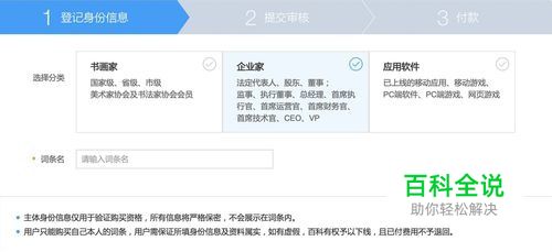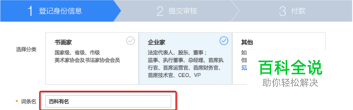 点击http://baike.baidu.com/member/authentication/memberinfo 进入百科有名认证页面,选择分类。(根据申请主体,选择所属分类) 注:申请步骤以企业家分类申请为例,勾选“企业家”分类,选择分类后会展示需要提交的认证资料。