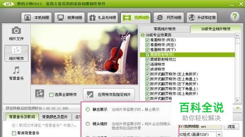 几百种酷炫转场特效一键设置,图片制作酷炫视频 卷画特效、帘窗特效、枫叶特效、散射特效等近500种相片转场特效,勾选“选择全部特效”选项,随机搭配酷炫特效。当然,如果你想为图片一一设置,那可以点击“应用特效到指定相片”按钮,一键设置的。 樱花飘落、烟雨蒙蒙、爱心泡泡等浪漫动感场景,在“当相片展示时”的对话框中,选择“动感场景”或“双重动态”即可启动的。