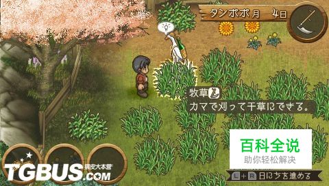 设定完角色名字后进入牧场,荒废的牧场只有几颗树和一些还没完全成长的牧草。过剧情后系统赠送一对土拨鼠给我们。直接进入第二天,发现牧草已经完全长 成,可以收割了。这里注意,完全长成的牧草收割后放置在地上,过几天就能得到干草了。未长成的牧草收割后得到大草堆。(得到镰刀)