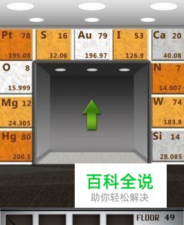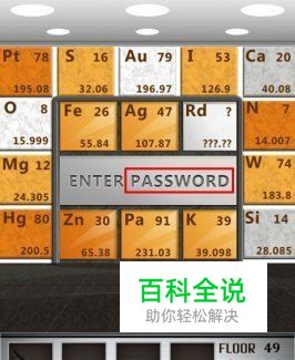 在第四十九关中,电梯门及门边的墙上有许多的元素符号,钙、铁、锌、锡、维生素(貌似是广告语?)。其实这些元素符号都是迷惑玩家的,在电梯门的中间刻着ENTERPASSWORD(输入密码),玩家只要输入密码就可以打开电梯门了(是不是觉着小编说了一通废话?),其实不是,这就是中国文字的博大精深。
