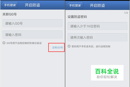 由于我们今天讲的是防盗密码,就不选择QQ开启了,因为QQ开启只需要输入QQ号和QQ密码就行了。我们选择【没有QQ号】,选择后我们设置一下防盗密码,例如密码是11,点击【下一步】。
