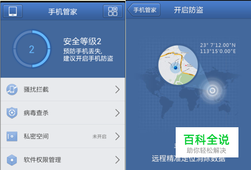 我们从开启防盗说起,首先进入手机管家>安全防护>手机防盗页面。右图为开启防盗时画面,点击【立即开启】。