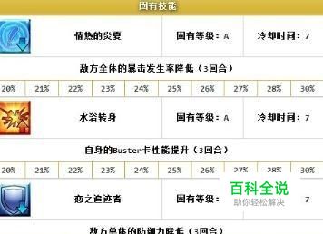 情热的炎夏 固有等级A 效果:敌方暴击发生率全体下降3回合 从20%-30% 点评:这种降低概率的技能是最不靠谱的,且幅度最高也就30%,对周回本小鬼或许有效,面对boss基本没用。