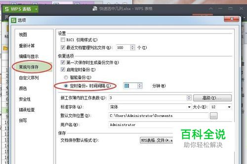 然后,在打开的选项对话框中选择常规与保存——恢复选项——定是备份,时间间隔,这里一般设置为一分钟保存一次就好,如下图