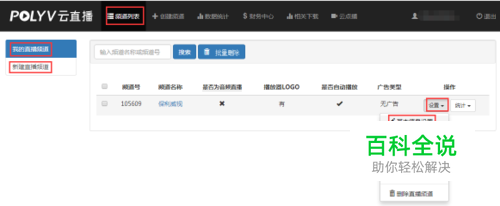 登录保利威视后台并点击【云直播】——【频道列表】,然后点击【我的直播频道】,点击您想修改的频道名称(若还没有创建频道,可点击【新建直播频道】新创建一个频道),再点击【设置】项的【基本信息设置】,如下图: