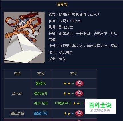 孔明 Hit 给分表 1~4 5 6 7 8 9 10 0 5000 60000 150000 300000 320000 330000 角色连技表 入力方式 HIT数 总和分数 →→A+AAA+↓↘→A+A 6~7 65000~215000 →→A+AA+→→A+AAA+↓↘→A 8 515000 AA+→→A+AAA+↓↘→A+A 9 835000