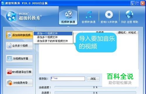 导入要加音乐的视频 超级转换秀具有非常强大的视频处理和音频处理功能,要给视频加音乐,点击“视频转换通”选项卡面板左上角的“添加待转换视频”按钮,将要加音乐的视频导入。