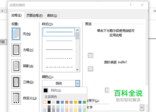 边框设置选“无”,颜色由“自动”改为“白色”,然后应用于“段落”,点击“确定”。
