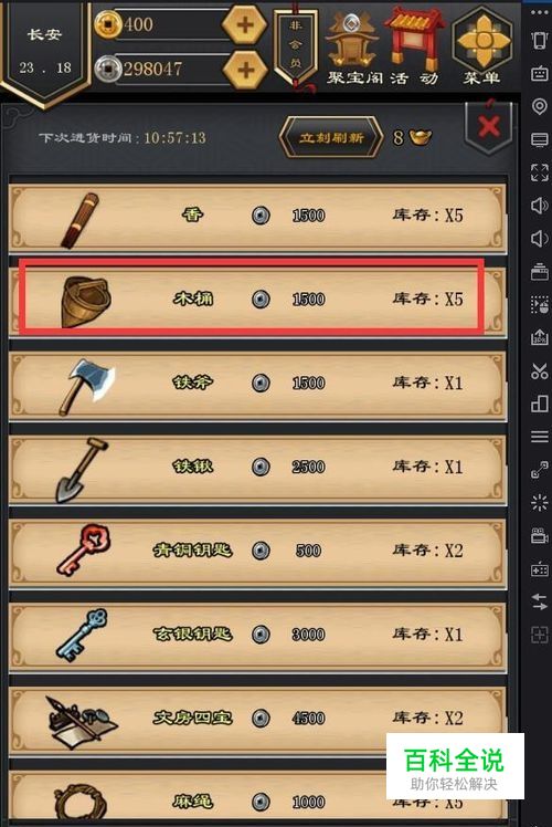 工欲善其事必先利其器,这个方法想要刷经验、刷阅历、刷钱,首先你要去长安的杂货铺买一个水桶,最好多买几个,也不贵。