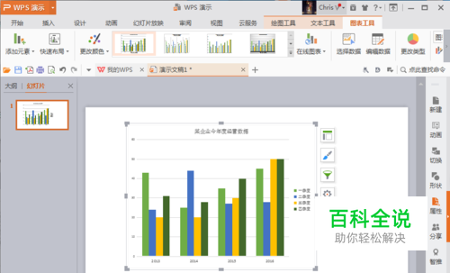 接下来要将我们准备展现的数据编写入“演示中的图表”中,这里我们模拟某公司近今年度经营数据,辨别好系列与类别后录入数据,注意检查数据,不要弄错了,随着数据的录入,柱形图会随时更新;