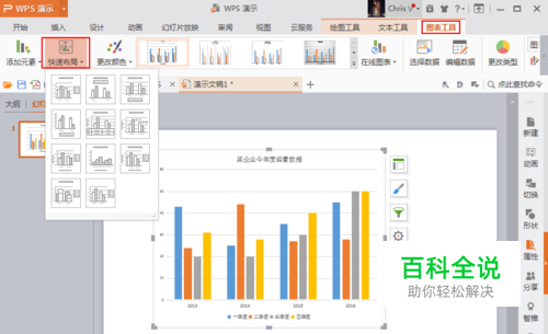 除此之外,我们还可以点击图表或上方菜单栏“图表工具”——“快速布局”调整图表布局;点击右侧“更改颜色”,调整至自己喜欢的图表颜色,是不是也没那么难呢,快快试试吧!