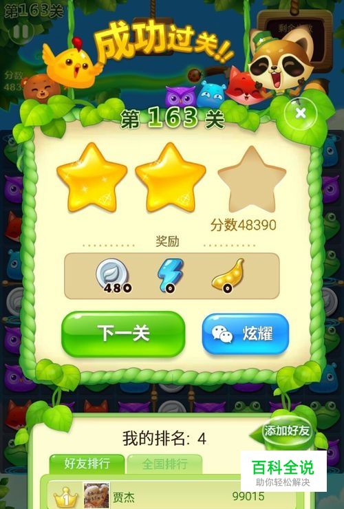 这时可获得2个黄色的小星星,在第163关,分数已经被积累到了48390分,然后点击确定即可。