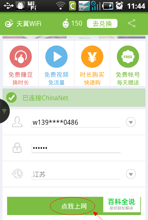 当手机处在中国电信ChinaNet信号之中时,打开天翼WiFi客户端,“点我上网”按钮显示可选