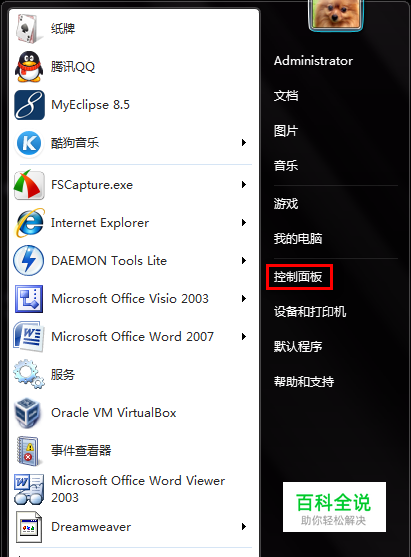 1、在系统开始菜单中选中控制面板,打开“控制面板”程序。