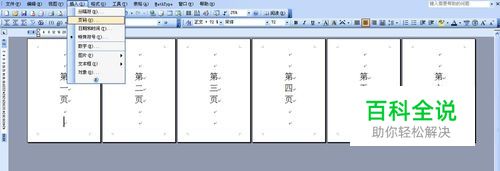 光标放在第四页末端,插入分页符;完成后光标放在第五页,插入页码。