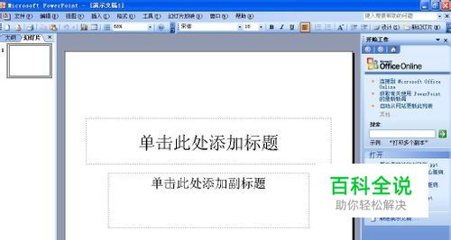 标题幻灯片就是位于演示文稿的首页的,也就是地一张幻灯片。我们都知道,刚打开一个空的演示文稿,系统会自动创建一张幻灯片,如图所示,这时的标题幻灯片的版式也是默认选择的,自动进入了普通视图,这样就可以直接在文稿窗口区域加工标题幻灯片了。