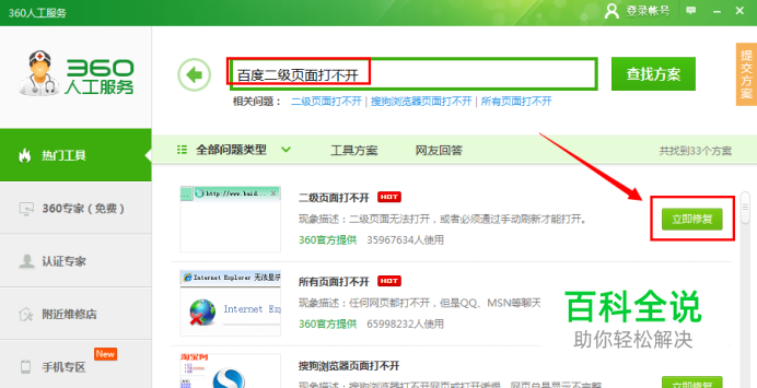 在弹出的窗口中,输入“二级页面打不开”,从搜索结果中点击“立即修复”按钮来执行修复操作即可。