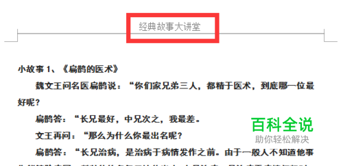 打开文档页面。随意打开文档其中的一个页面,如图所示,接下来将“经典故事大讲堂”改成“小故事大讲堂”。