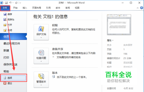 点击word工具栏上的”文件“菜单,在弹出的下拉框中选择”选项“按钮,然后会弹出一个窗口。
