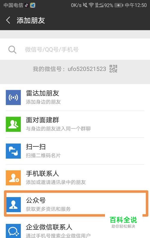 在顶部搜索栏输入公众平台微信号或公众号名称,点击搜索标志后下方显示出目标公众号彩虹电视在线,点开它就看到公众号的资料
