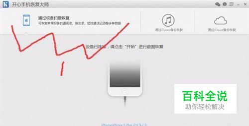 点击顶端的【通过设备扫描恢复】,并且连接您的手机(如果您是第一次安装开心手机恢复大师,则需要在手机上点击信任按钮);点击【开始】按钮,直接进入扫描设备恢复模式。