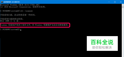 Windows 10系统在管理员命令提示符窗口中,使用sfc /scannow命令修复系统,但出现了问题,显示: Windows 资源保护找到了损坏文件,但 Windows 资源保护无法启动修复服务。
