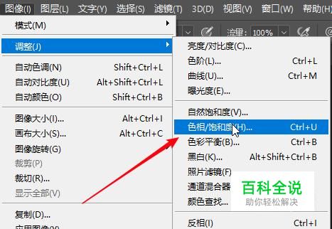 依照次序,点击菜单栏,图像,调整,色相饱和度。