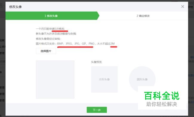 编辑头像: 头像上传成功后,会出现一个在聊天中使用的方形和在公众号资料页使用的圆形预览头像,可根据需求调整编辑,确定修改后点击下一步。