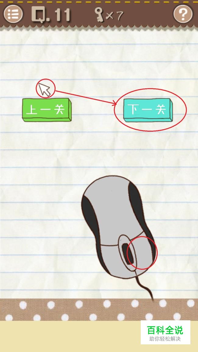第十一关是叫我们点击进入下一关,我们需要倒置手机,然后将鼠标光标置于蓝色“下一关”上面,再点击鼠标左键即可过关。