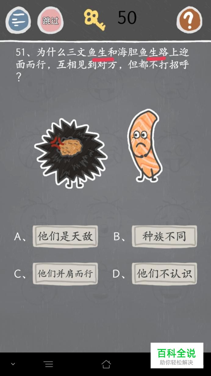第五十一关:一起点击题目中的【生】,选项是迷惑的。