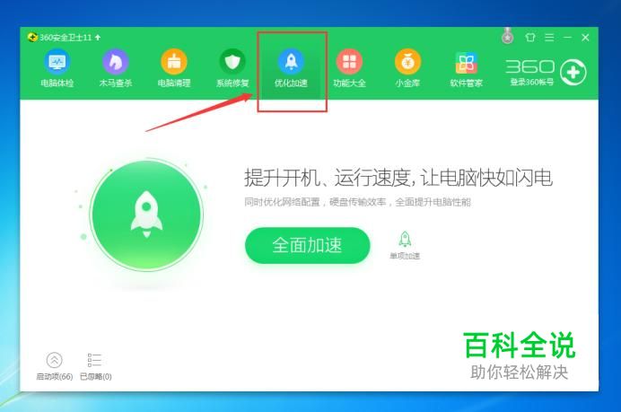 步骤1:双击打开【360安全卫士】,然后选择【优化加速】选项,如下图所示: