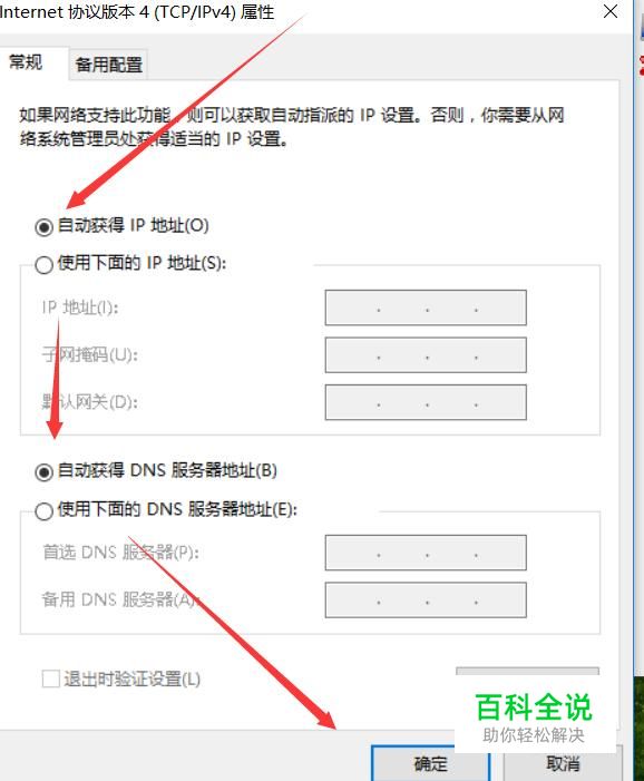 然后选中自动获取IP地址,点击确定,应该就没问题了。