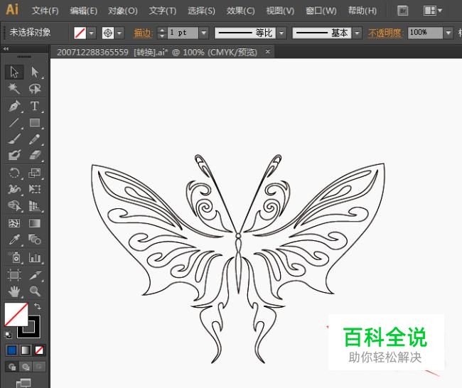 接着我们来画一个比较复杂的啦,我们这个时候先从右边画了,选择钢笔工具,接着设置好描边颜色,就来画我们蝴蝶的翅膀啦,这个过程的话考验我们对蝴蝶翅膀的理解啦,我们的话可以先在课本上找到类似的来临摹下,接着再用软件画,如下图所示。