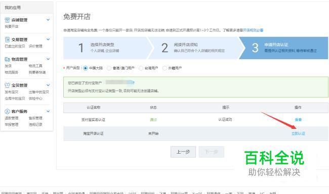 开店这里注意,需要支付宝实名认证,还需要淘宝店铺认证之后按照流程,一般1-3个工作日就会有结果出来,记得上传10张你的产品的照片。