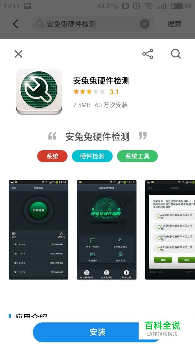安兔兔硬件检测 对你的Android 手机、平板进行一系列的硬件评测,如电池电量、屏幕亮点、多点触摸等。让你在购买及使用过程中,更清楚知道手机、平板的硬件是否存在问题。