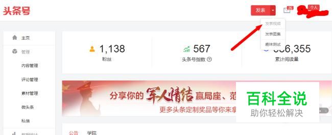 登陆自己的头条号,点击右上方“发表”的下拉菜单中的“发表视频”