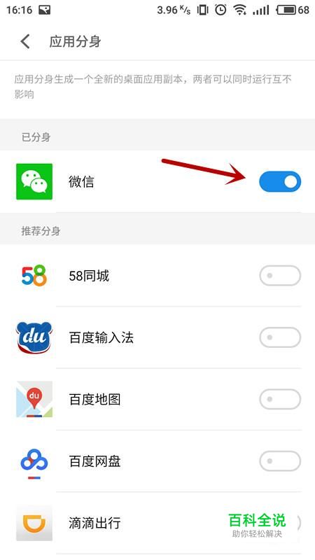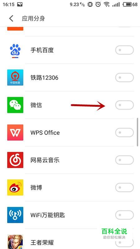 在应用分身中找到微信,将右侧滑块开启。
