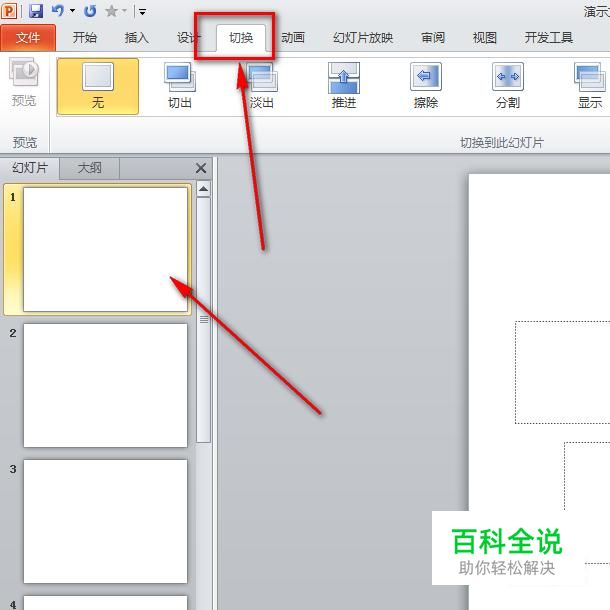 首先,选择好幻灯片,然后点击“切换”,随便选择切换菜单下的切换效果。