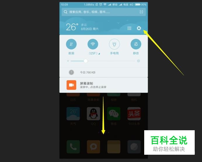 打开手机设置 我们的手机系统的首页,在屏幕上面往下拉,就可以看到手机的通知栏,在通知栏的右上角,点击设置,进入到手机的设置里面。