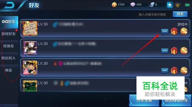 好友分为QQ好友和游戏好友,点击好友名字后面的消息图标,如图所示。