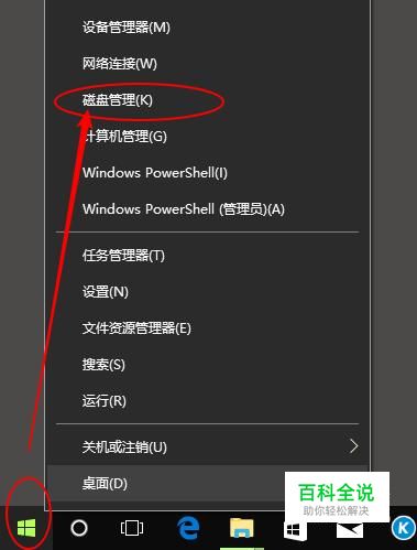 在电脑桌面,鼠标右击开始,选择磁盘管理
