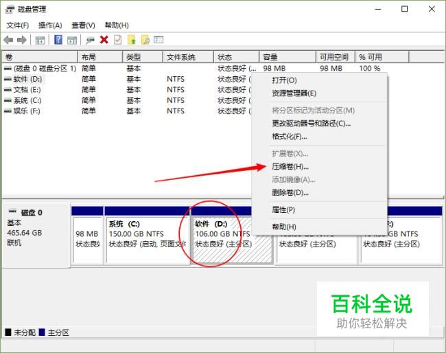 选中一个磁盘,鼠标右击,点击压缩卷,这样该磁盘就会腾出空余空间。