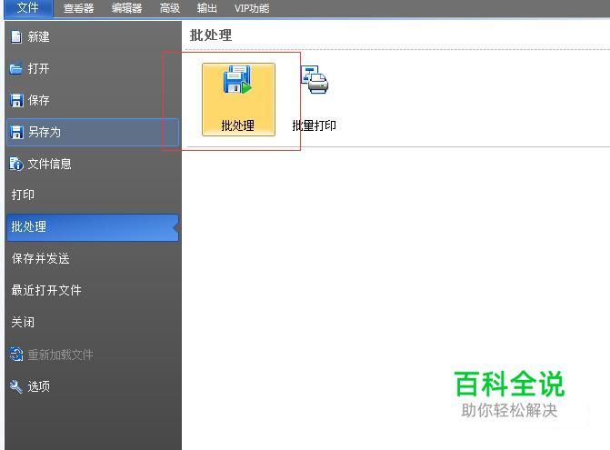 打开软件之后,我们会看到软件的左上角的“文件”,点击打开,选择“批处理”。