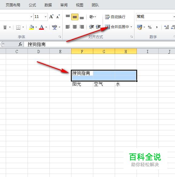 如图,选中标题行,然后点击“合并后居中”选项按钮。