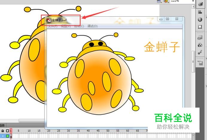 颜料桶工具 使用【颜料桶工具】填充舞台上金蝉子的颜色,然后更改舞台的颜色为天蓝色,如下图所示: