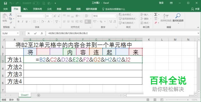 在方法1中的单元格中输入公式=B2&C2&D2&E2&F2&G2&H2&I2&J2,输入后按回车