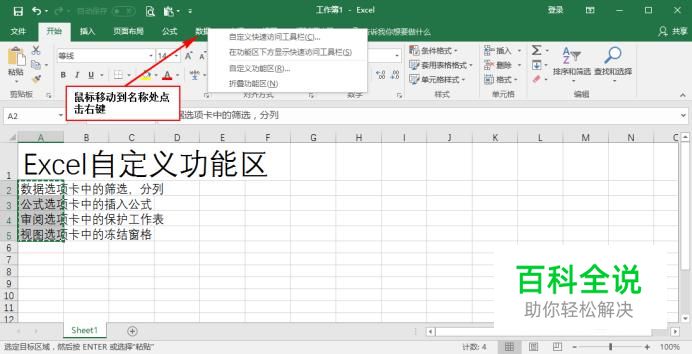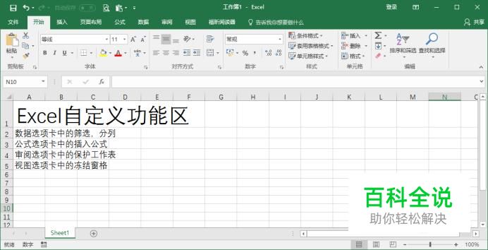 将数据选项卡中的筛选,分列;公式选项卡中的插入公式;审阅选项卡中的保护工作表;视图选项卡中的冻结窗格 这五个功能放到自定义功能区里