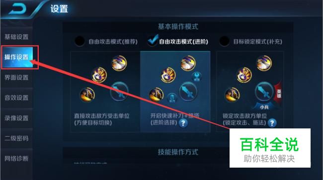 来到设置界面之后,同样找到操作设置选项,点击操作选项。找到三个技能的操作选项。我们先来学习第一个操作“自由攻击模式(推荐)”。选好之后点击设置界面右上角的“×”